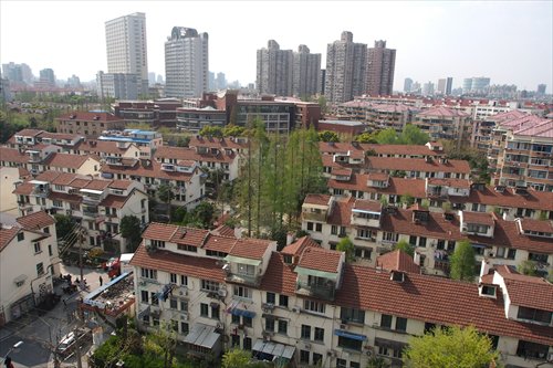 The Fangua Lane neighborhood (red roofed) stands surrounded by high-rises and elevated roads. Photo: CFP