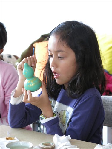 Painting materials and gourds are then distributed among the students. Gourds come in all shapes and sizes: some are big, some are small, some are fat, some are slim, some are irregular. Shi shows the class her own personal gourd paintings, which were inspired by both traditional and modern art styles, to get her students' creative juices going. She advised two French girls attending this day's lesson to use the fat gourds, which are easier to hold and control while painting.