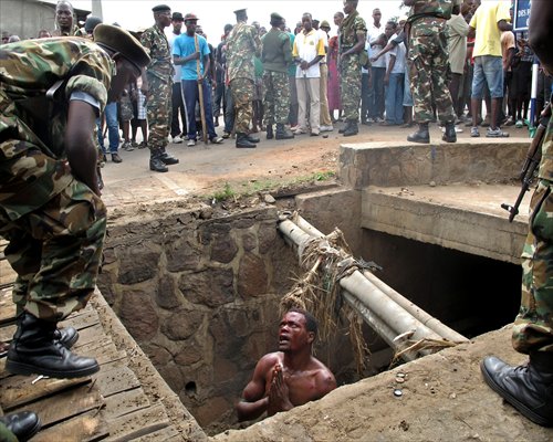 A man begs for help from the military from a bunker where he had hid on Thursday to escape a lynchmob in the Cibitoke district of Burundi's capital, Bujumbura. The man, who was suspected to be an 'Imbonerakure,' or member of the Youth League of Burundi's ruling party, was finally saved by the army. At least three people were killed in clashes in Burundi. Photo: AFP