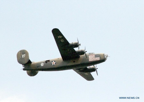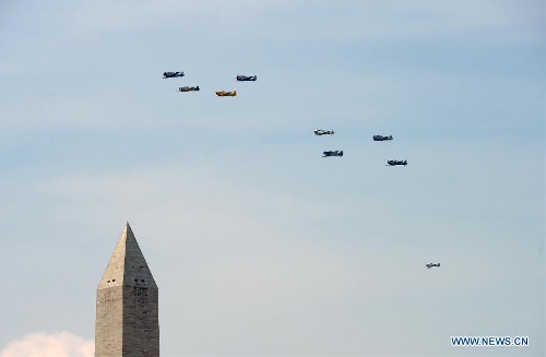 World War II vintage aircraft fly over Washington D.C., capital of the United States, May 8, 2015. Diverse arrays of U.S. World War II aircraft flew over the capital Washington D.C. Friday, commemorating the 70th anniversary of World War II victory in Europe. (Xinhua/Lei Bosong)