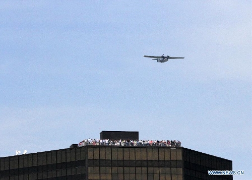 People view World War II vintage aircraft flying over Washington D.C., capital of the United States, May 8, 2015. Diverse arrays of U.S. World War II aircraft flew over the capital Washington D.C. Friday, commemorating the 70th anniversary of World War II victory in Europe. (Xinhua/Lei Bosong)