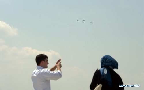 people take photos of World War II vintage aircraft flying over Washington D.C., capital of the United States, May 8, 2015. Diverse arrays of U.S. World War II aircraft flew over the capital Washington D.C. Friday, commemorating the 70th anniversary of World War II victory in Europe. (Xinhua/Yin Bogu)
