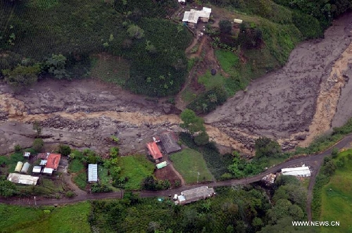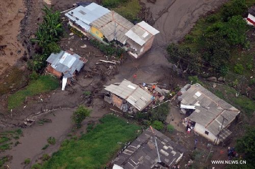 Photo taken on May 18, 2015 shows the aerial view of the site affected by a landslide in the municipality of Salgar, department of Antioquia, northwest Colombia. At least 40 people were killed in a landslide caused by heavy rains in Colombia earlier this morning, while dozens more were still missing, according to local authorities. (Xinhua/COLPRENSA)