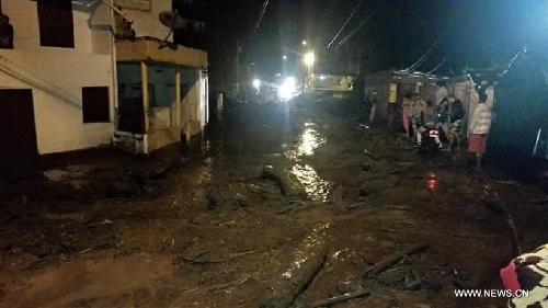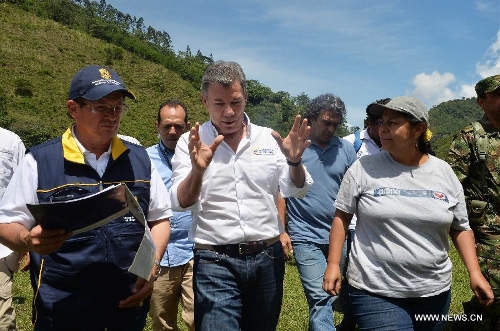 Image provided by Colombia's Presidency shows Colombian President, Juan Manuel Santos (C), talking with the Director of the National Unit for Disaster Risk Management, Carlos Ivan Marquez (L) in the site affected a landslide in the municipality of Salgar, department of Antioquia, northwest Colombia. At least 40 people were killed in a landslide caused by heavy rains in Colombia earlier this morning, while dozens more were still missing, according to local authorities. (Xinhua/Cesar Carrion/Colombia's Presidency)