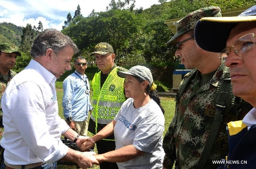 Image provided by Colombia's Presidency shows Colombian President, Juan Manuel Santos (L), shaking hands with a resident in the site affected a landslide in the municipality of Salgar, department of Antioquia, northwest Colombia. At least 40 people were killed in a landslide caused by heavy rains in Colombia earlier this morning, while dozens more were still missing, according to local authorities. (Xinhua/Cesar Carrion/Colombia's Presidency)