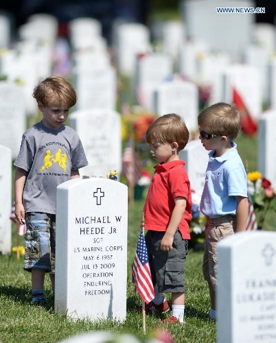 Children stand near tombs at section 60 of Arlington National Cemetery, outside Washington D.C., the United States, May 25, 2015. People crowded in Arlington National Cemetery, especially in Section 60, where those who died in America's most recent wars lie, during the Memorial Day.(Xinhua/Yin Bogu)