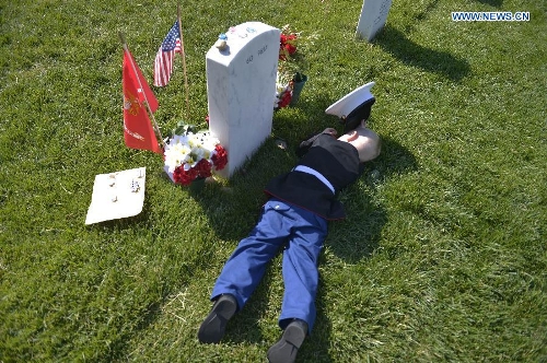Christian Jacobs lies besides the tomb of his father Christopher Jacobs at section 60 of Arlington National Cemetery, outside Washington D.C., the United States, May 25, 2015. People crowded in Arlington National Cemetery, especially in Section 60, where those who died in America's most recent wars lie, during the Memorial Day.(Xinhua/Yin Bogu)