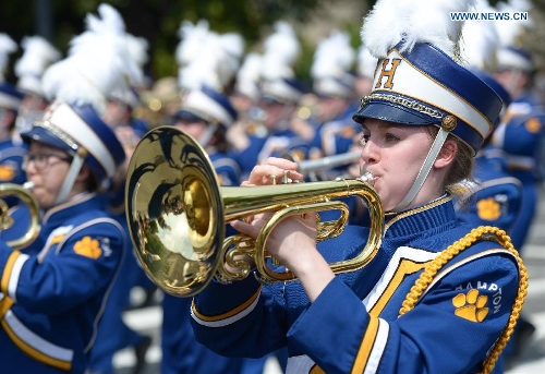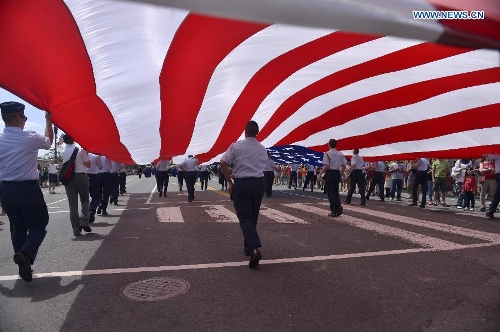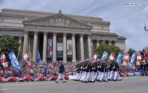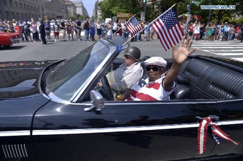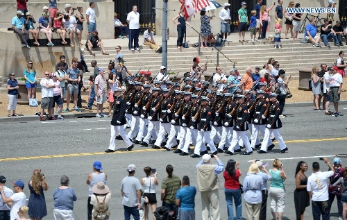 People participate in a Memorial Day parade on Constitution Avenue in Washington D.C., the United States, on May 25, 2015. The Memorial Day is a United States federal holiday observed on the last Monday of May. (Xinhua/Yin Bogu)