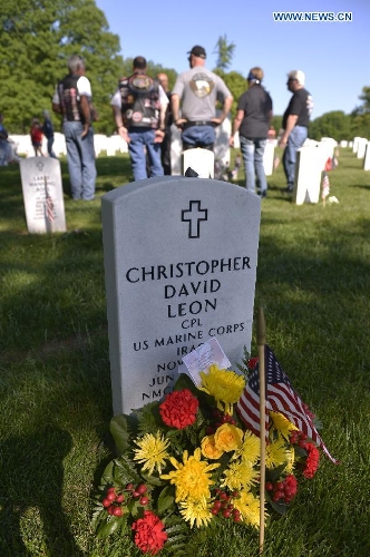 Veterans mourn their friends at section 60 of Arlington National Cemetery, outside Washington D.C., the United States, May 25, 2015. People crowded in Arlington National Cemetery, especially in Section 60, where those who died in America's most recent wars lie, during the Memorial Day.(Xinhua/Yin Bogu)