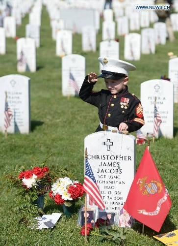 Christian Jacobs stands besides the tomb of his father Christopher Jacobs at section 60 of Arlington National Cemetery, outside Washington D.C., the United States, May 25, 2015. People crowded in Arlington National Cemetery, especially in Section 60, where those who died in America's most recent wars lie, during the Memorial Day.(Xinhua/Yin Bogu)