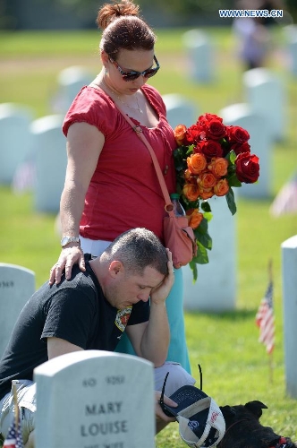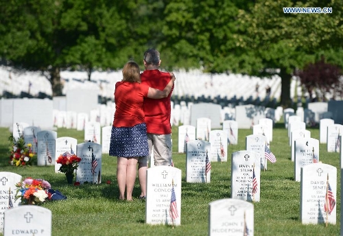Mr. and Mrs. Cappelaere stands in front of the tomb of their daughter Valerie at section 60 of Arlington National Cemetery, outside Washington D.C., the United States, May 25, 2015. People crowded in Arlington National Cemetery, especially in Section 60, where those who died in America's most recent wars lie, during the Memorial Day.(Xinhua/Yin Bogu)