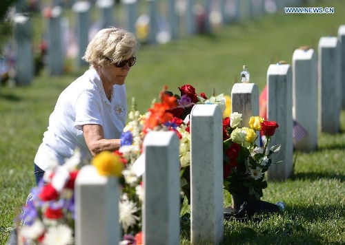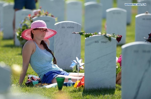 Phoebe Quin mourns her brother Michael Quin at section 60 of Arlington National Cemetery, outside Washington D.C., the United States, May 25, 2015. People crowded in Arlington National Cemetery, especially in Section 60, where those who died in America's most recent wars lie, during the Memorial Day.(Xinhua/Yin Bogu)