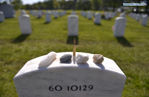 A bullet is seen on a tomb at section 60 of Arlington National Cemetery, outside Washington D.C., the United States, May 25, 2015. People crowded in Arlington National Cemetery, especially in Section 60, where those who died in America's most recent wars lie, during the Memorial Day.(Xinhua/Yin Bogu)
