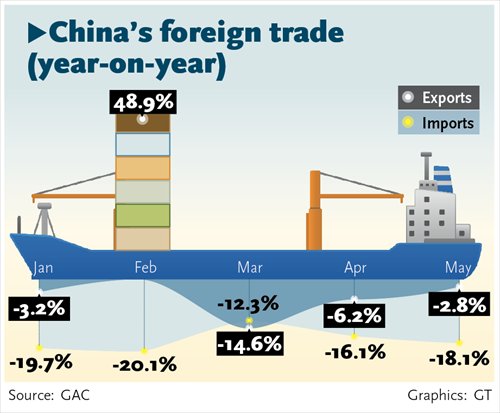Imports fell more heavily in May, dropping 18.1 percent year-on-year to 803.3 billion yuan, following a 16.1 percent decline in April.