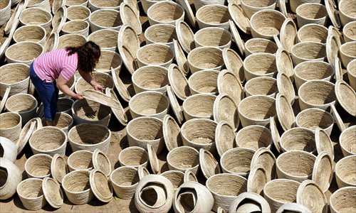 A farmer dries straw baskets that will be exported in Linyi, East China's Shandong Province. Photo: CFP