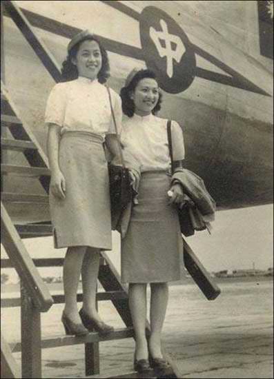 Two flight attendants stand in front of a CNAC airplane. In the 1940s, CNAC and Central Air Transport Corporation employed no more than a few dozen flight attendants. Two attendants would be assigned to large aircraft such as the C-200, while other planes had only one. Photo: Xinhua