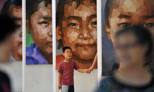 Local residents look at paintings at an art show themed on missing children in Nanjing, Jiangsu Province on Tuesday. Each painting is based on photos of a real child who went missing. The show has been widely circulated on the Internet so as to reach more people for information about the children's whereabouts. Photo: CFP
