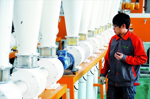 An employee works at a corn flour processing plant on March 26 in Jiamusi, Heilongjiang Province. Photo: CFP