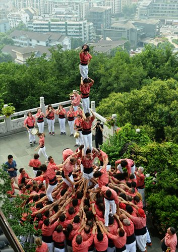 Performers from Spain build a human tower near Hangzhou's West Lake, Zhejiang Province, on Thursday. About 190 performers constructed the "castells," or human towers traditionally seen at festivals in Catalonia. Photo: IC