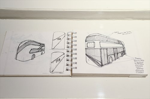 Sketchbooks complementing the models show how the projects were initially conceived - with sketch after sketch made in search of the ideal form, before arriving at the basic form of what we finally see.