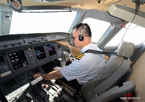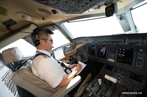 The polit of the ARJ21-700 jet conducts a demonstration flight in Xi'an, capital city of northwest China's Shaanxi Province, July 17, 2015. The ARJ21, short for Advanced Regional Jet for the 21st Century, is a type of regional airliner designed and manufactured by the Commercial Aircraft Corporation of China (COMAC). Over twenty representatives were invited on Friday to experience the one-hour demonstration flight and give feedbacks so as to help improve the overall performance of the jet. Photo: Xinhua