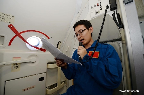 Engineer Jin Xing introduces the ARJ21-700 jet to passengers during a demonstration flight in Xi'an, capital city of northwest China's Shaanxi Province, July 17, 2015. The ARJ21, short for Advanced Regional Jet for the 21st Century, is a type of regional airliner designed and manufactured by the Commercial Aircraft Corporation of China (COMAC). Over twenty representatives were invited on Friday to experience the one-hour demonstration flight and give feedbacks so as to help improve the overall performance of the jet. Photo: Xinhua