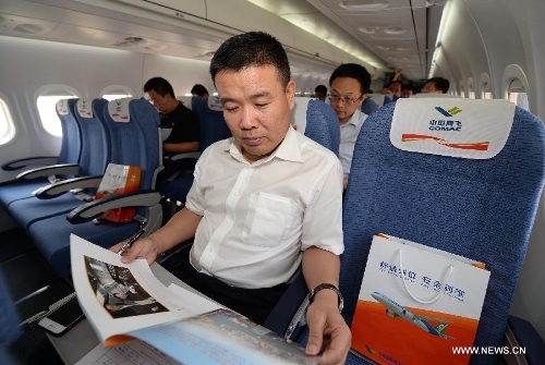 Passengers experience a demonstration flight of the ARJ21-700 jet in Xi'an, capital city of northwest China's Shaanxi Province, July 17, 2015. The ARJ21, short for Advanced Regional Jet for the 21st Century, is a type of regional airliner designed and manufactured by the Commercial Aircraft Corporation of China (COMAC). Over twenty representatives were invited on Friday to experience the one-hour demonstration flight and give feedbacks so as to help improve the overall performance of the jet. Photo: Xinhua