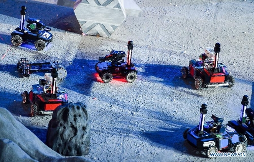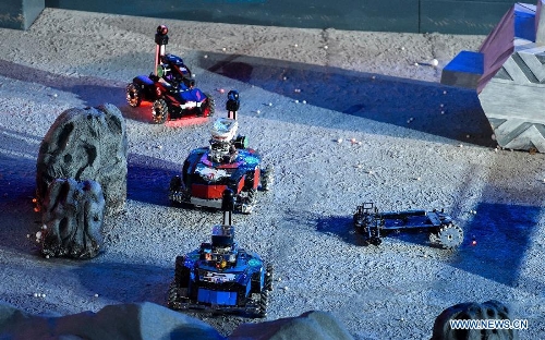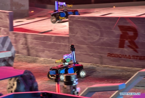 A robot made by students from Dalian Jiaotong University competes in the finals of "RoboMasters" 2015 Robocon in Shenzhen, south China's Guangdong Province, July 19, 2015. A total of 32 teams took part in the finals. Students from University of Electronic Science and Technology of China claimed the championship of 2015 Robocon. (Xinhua/Mao Siqian)