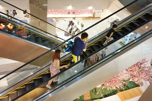 A boy runs on an escalator in a Shanghai shopping mall followed by two adults. Photo: IC