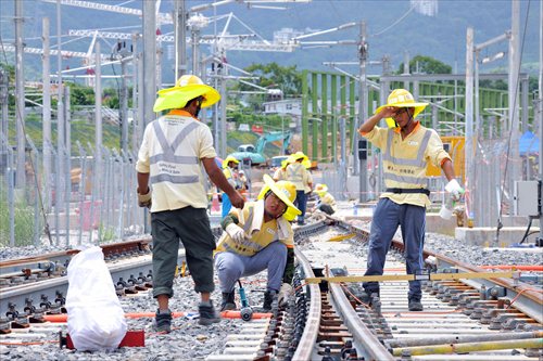 A construction crew works on the tracks of the Guangdong-Shenzhen-Hong Kong high-speed railway in Hong Kong on June 11. Photo: CFP