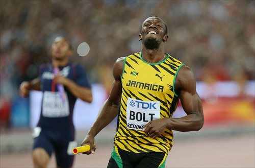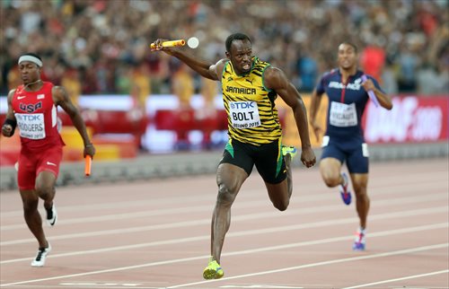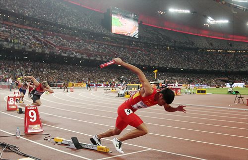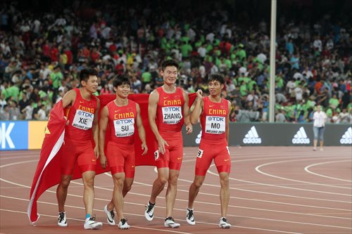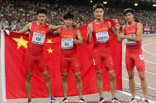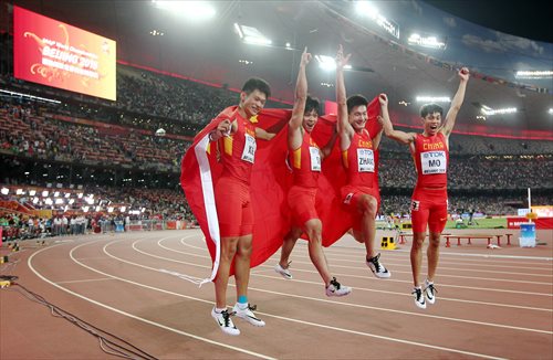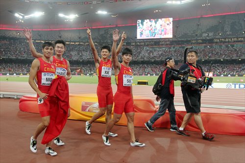 China claimed an historic silver in the men's 4x100 meter relay with a time of 38.01 seconds at the 2015 IAAF World Championships at the "Bird's Nest" National Stadium in Beijing,Aug.29, 2015. Usain Bolt anchored Jamaica to take gold. Photo: Cui Meng/GT