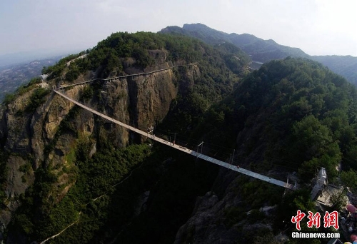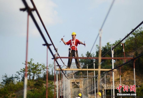 A wooden suspension bridge is being renovated at a geological park in Pingjiang county of Hunan province. A team of 11 workers are finishing a project that will turn the wooden bridge into a glass bridge. The project plans to be completed before Oct 1, the national day holiday. Photo:Chinanews.com