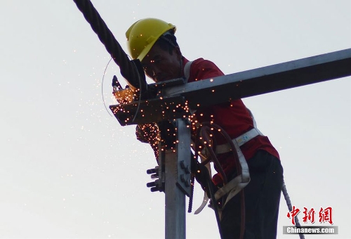 Workers fasten the support of the bridge. Photo:Chinanews.com