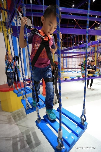 A child tries to maintain balance at a training base in the "East Dream, Future World" aerospace theme park in Sanhe, north China's Hebei Province, Sept. 27, 2015. The theme park covers an area of 33,700 square meters, including 13 interactive exhibitions and 18 interactive games. (Xinhua/Li Mingfang)