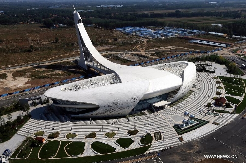 Photo taken on Sept. 27, 2015 shows a sculpture of "agravic water drops" at the entrance of the "East Dream, Future World" aerospace theme park in Sanhe, north China's Hebei Province, Sept. 27, 2015. The theme park covers an area of 33,700 square meters, including 13 interactive exhibitions and 18 interactive games. (Xinhua/Li Mingfang)