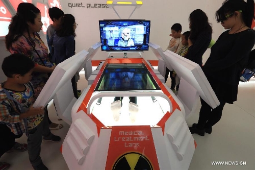 Tourists learn medical technology of outer space at the "East Dream, Future World" aerospace theme park in Sanhe, north China's Hebei Province, Sept. 27, 2015. The theme park covers an area of 33,700 square meters, including 13 interactive exhibitions and 18 interactive games. (Xinhua/Li Mingfang)