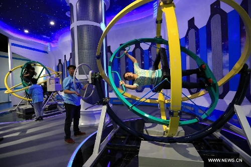 Tourists experience space flight training machine at the "East Dream, Future World" aerospace theme park in Sanhe, north China's Hebei Province, Sept. 27, 2015. The theme park covers an area of 33,700 square meters, including 13 interactive exhibitions and 18 interactive games. (Xinhua/Li Mingfang)