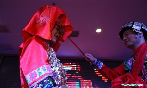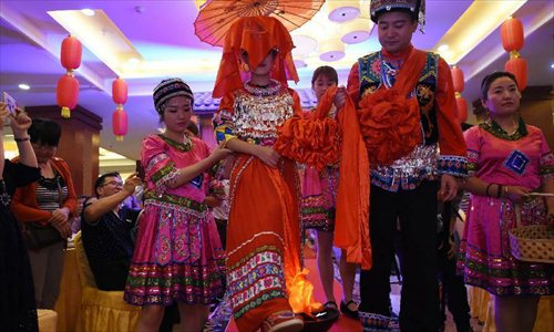 Bridegroom Shi Jun and bride Zhang Yongdong attend their wedding ceremony in Huaihua, central China's Hunan Province, Oct. 2, 2015. Shi Jun and Zhang Yongdong, a Miao ethnic young man and a Han girl, held their wedding ceremony in the traditional way of Miao ethnic group on Friday. Photo: Xinhua