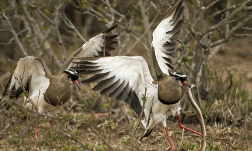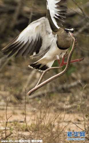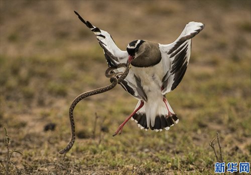 Photo shows that a lapwing is fighting to expel a snake when the snake attempts to feast on the lapwing's clutch of eggs in the Kruger National Park in South Africa. (Source: xinhuanet.com)