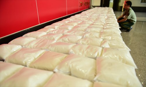 Confiscated drugs on display in Dongguan, Guangdong Province, in June Photo: CFP
