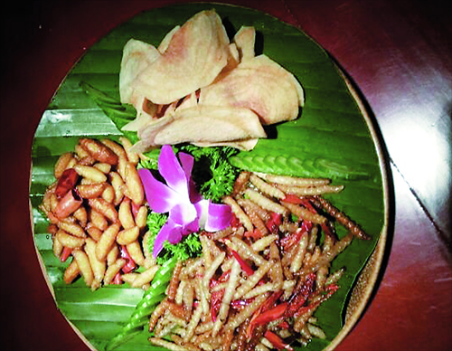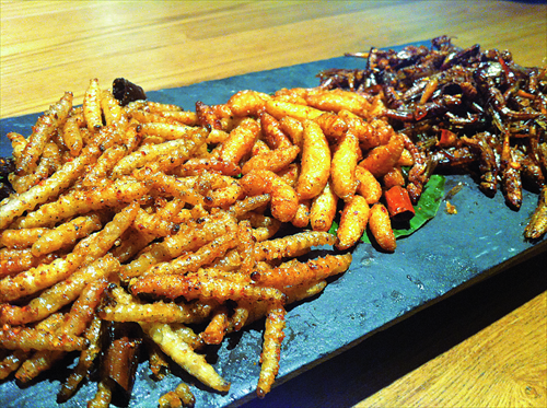 The deep-fried insects are neatly placed in three stacks on delicate stone plates. The left stack is made up of the 2-centimeter-long stick insects, which look like mini-sized silkworms in appearance. They taste oily and a little bitter.
