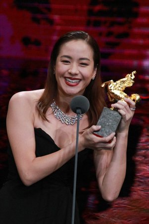 Karena Lam accepts her Golden Horse awards in Taipei on Saturday. Photos: CFP