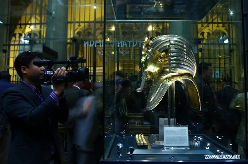 Media representatives take photos and videos of the golden mask of Tutankhamun, at the Egyptian Museum, in Cairo, Egypt, on Dec. 16, 2015. The golden burial mask of King Tutankhamen, one of ancient Egypt's most famous artifacts, was put back Wednesday on display at the Egyptian Museum after eight weeks of restoration by an Egyptian-German team. (Xinhua/Ahmed Gomaa)