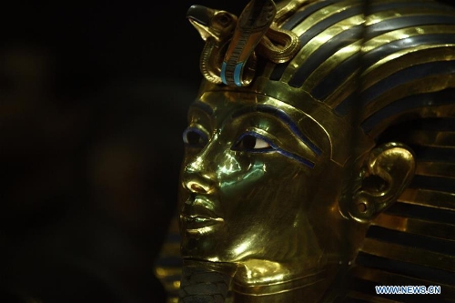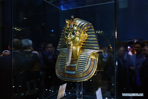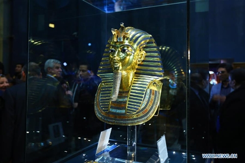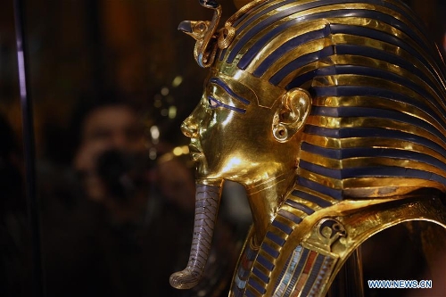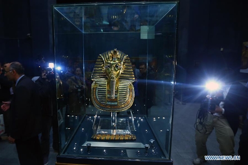 Photo taken on Dec. 16, 2015 shows the golden mask of Tutankhamun at the Egyptian Museum, in Cairo, Egypt. The golden burial mask of King Tutankhamen, one of ancient Egypt's most famous artifacts, was put back Wednesday on display at the Egyptian Museum after eight weeks of restoration by an Egyptian-German team. (Xinhua/Ahmed Gomaa)