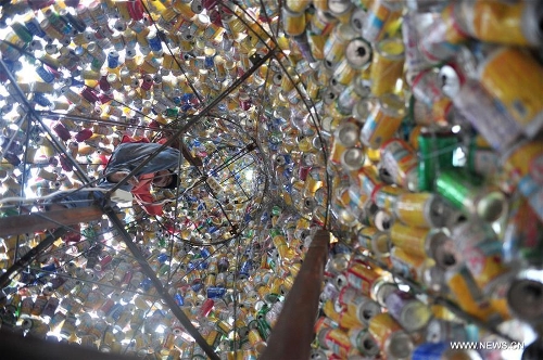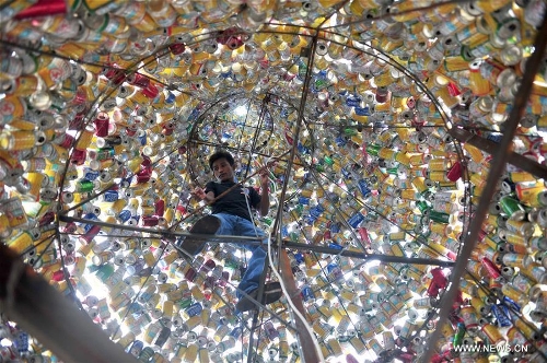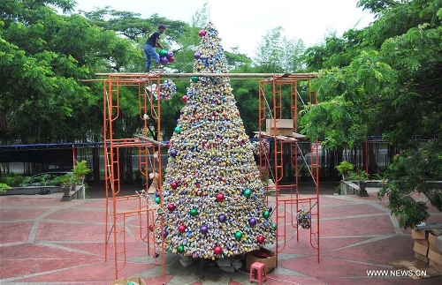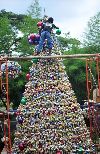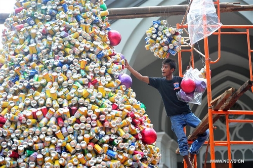 A worker decorates a Christmas tree made from tin cans of drinks at the Church of Santo Laurensius at Tangerang, Banten province, Indonesia, Dec. 18, 2015. A total of 10 thousand cans were donated by church members to make a Christmas tree with 8 meters high. (Xinhua/Zulkarnain)