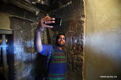A man takes a selfie in front of the image of Maia, the wet-nurse of ancient Egyptian king Tutankhamun, at her tomb located in Saqqara of Giza province, 30 kilometers south of Cairo, Egypt, on Dec. 20, 2015. The tomb of Maia, discovered by French archeologist Alain Zivie in 1996, will be open to the public soon, according to Egypt's Ministry of Antiquities. (Xinhua/Ahmed Gomaa)
