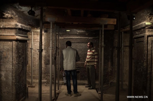A guide (R) talks with a journalist inside the tomb of Maia, the wet-nurse of ancient Egyptian king Tutankhamun, in Saqqara of Giza province, 30 kilometers south of Cairo, Egypt, on Dec. 20, 2015. The tomb of Maia, discovered by French archeologist Alain Zivie in 1996, will be open to the public soon, according to Egypt's Ministry of Antiquities. (Xinhua/Pan Chaoyue)