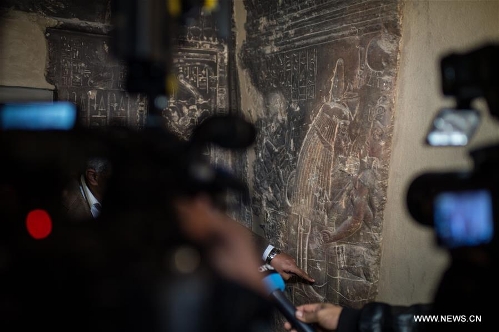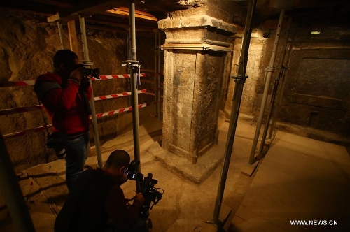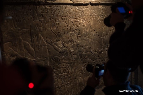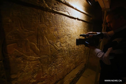 Journalists take photos and video clips at a cult chamber in the tomb of Maia, the wet-nurse of ancient Egyptian king Tutankhamun, in Saqqara of Giza province, 30 kilometers south of Cairo, Egypt, on Dec. 20, 2015. The tomb of Maia, discovered by French archeologist Alain Zivie in 1996, will be open to the public soon, according to Egypt's Ministry of Antiquities. (Xinhua/Pan Chaoyue)