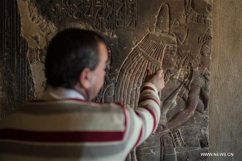 A guide points out the image of Maia, the wet-nurse of ancient Egyptian king Tutankhamun, at her tomb located in Saqqara of Giza province, 30 kilometers south of Cairo, Egypt, on Dec. 20, 2015. The tomb of Maia, discovered by French archeologist Alain Zivie in 1996, will be open to the public soon, according to Egypt's Ministry of Antiquities. (Xinhua/Pan Chaoyue)