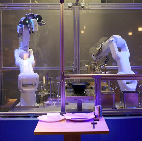 Two robotic arms from Japan work at a noodle shop in Hongkou district Thursday. The automated chefs can prepare a bowl of noodles within 90 seconds. Photo: Yang Hui/GT